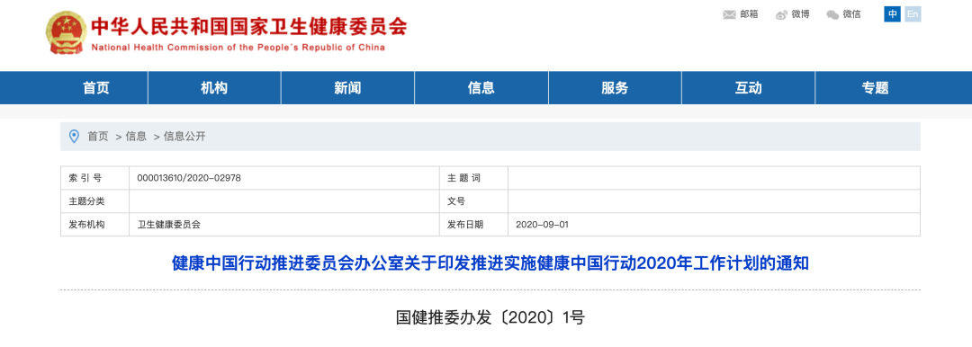9月1日,健康中國(guó)行動(dòng)推進(jìn)委員會(huì)辦公室發(fā)布《推進(jìn)實(shí)施健康中國(guó)行動(dòng)2020年工作計(jì)劃》(以下簡(jiǎn)稱(chēng)《計(jì)劃》)。